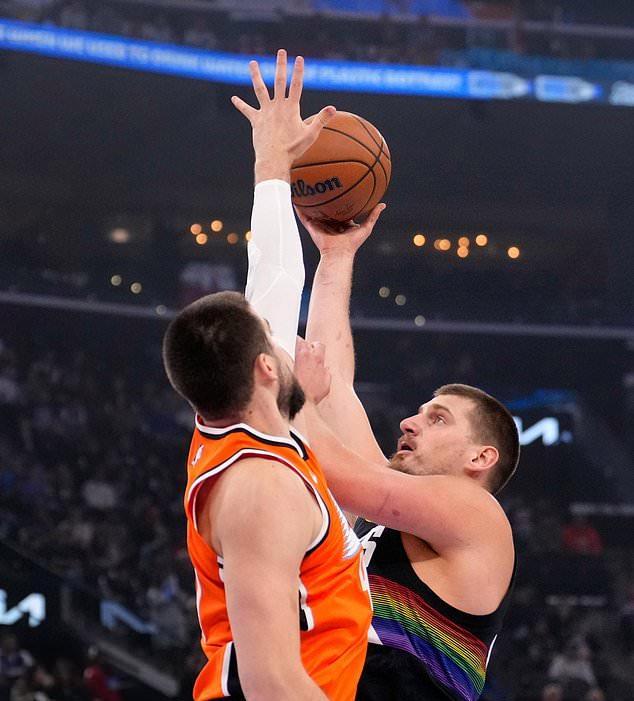 本场比赛,约基奇状态火爆,首节就独得25分,占掘金全队单节39分的近七成。第二节他贡献8分,第三节再度爆发砍下19分,第四节大部分时间作壁上观,仅末段再添3分便完美收官。全场他23投18中,三分球6中5,罚球16中14,还送出6次助攻,险些将自己领跑联盟的三双次数(6次)再添一笔。
