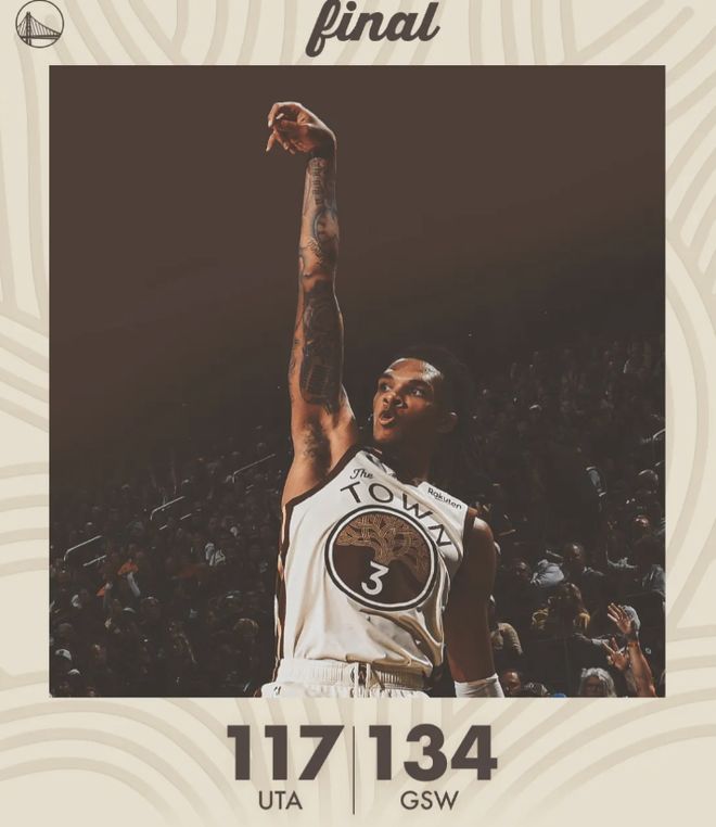 第四节决战,科利尔径直杀向篮筐欲上篮,波斯特镇守禁区直接将球按下,库里面对努尔基奇长臂干扰,向天空一挑丝滑命中,锁定今日十佳球,随后借掩护坚决出手三分再次命中,分差拉开至25分。比赛已经没有悬念,最终,勇士134-117以17分之差轻松击败爵士,终结3连败的同时,送给对手4连败。