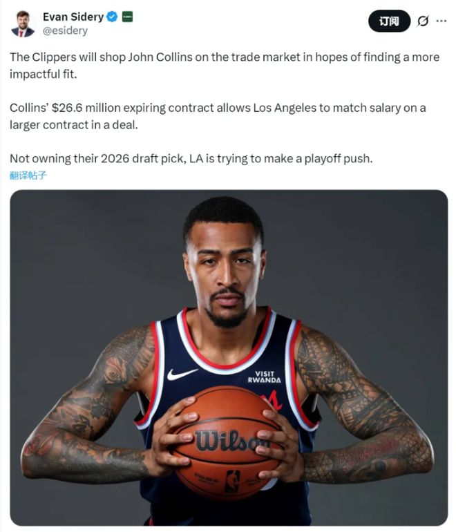 毕竟,他们目前并无俯冲摆烂的资本——手中没有任何2026年的首轮选,该选秀权已被雷霆队掌控,因此只能通过调整阵容来寻求改变。颇为讽刺的是,今年休赛期,快船队刚用鲍威尔加上一枚2027年的次轮选秀权换来了柯林斯,然而赛季尚未过半,就已开始寻求交易柯林斯。