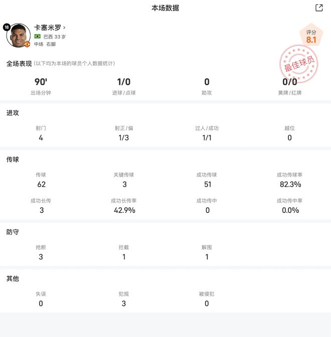 雷速体育11月2日讯 今天凌晨刚刚结束的英超第10轮,曼联客场2-2战平诺丁汉森林。本场比赛卡塞米罗首发打满全场,并帮助球队首开纪录。森林队下半场两分钟内连进2球反超比分,比赛最后阶段迪亚洛的世界波帮助曼联扳平。
